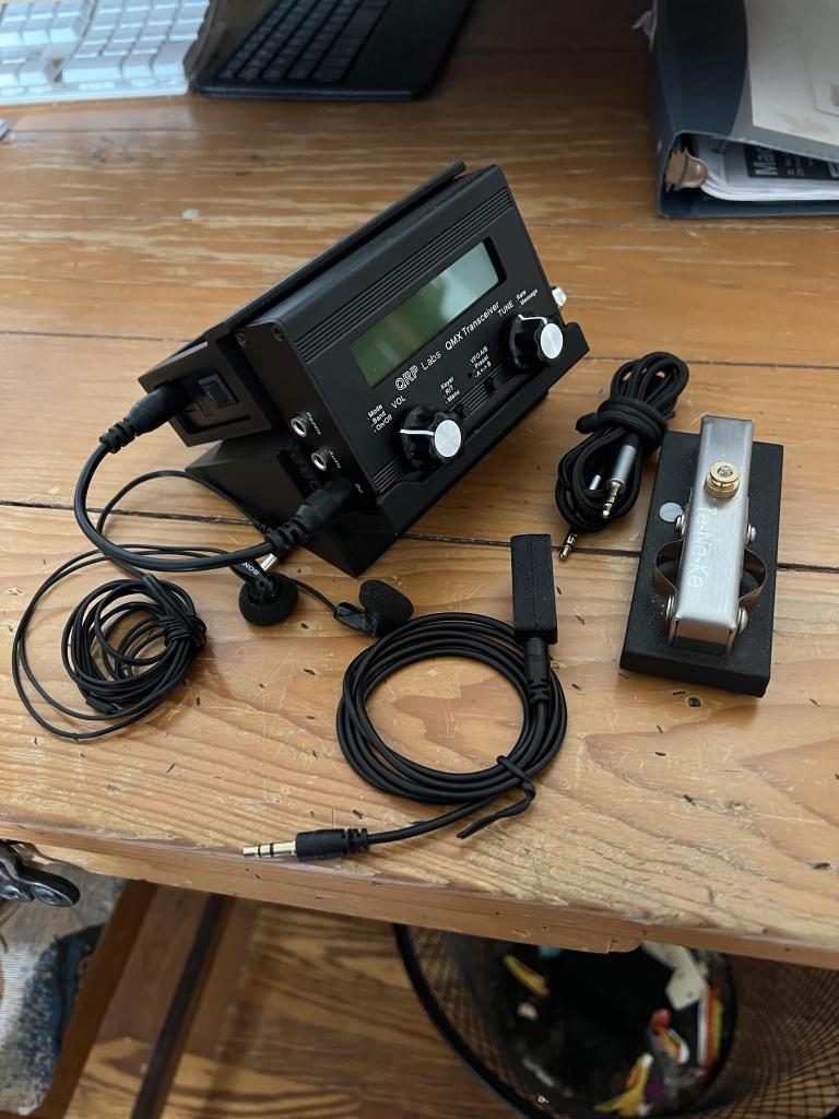 1) a factory built QRP Labs QMX 5W Multi-Band, Multi-Mode Transceiver + 2) a Dream Labs 3D printed desk/bench/table stand that holds BOTH the transceiver (in operating position) + 3) a TransCell 3000Ah 12V Power Bank + 4) a TeeNee Key (with weighted desk base) + 5)tiny PTT electret MiniMic + 6) pair of wired SONY ear buds + 7)all cables & cords.