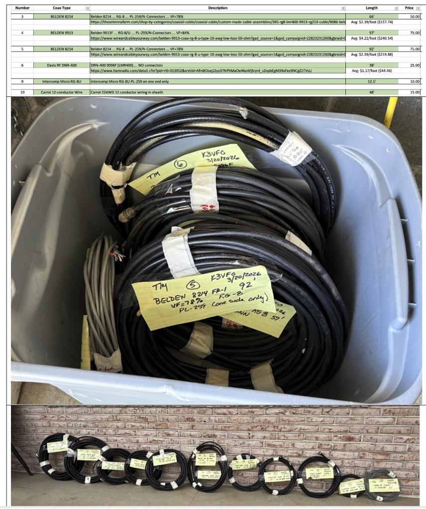 This is the final bit of the cleanup I did around Thanksgiving from a working Ham estate in northern VA. The weather has just become good enough for me to roll each of them out, measure the length, and attempt to identify each, as best I could. I've used the markings on the sleeve to cross reference, and then rolled each of them up, and put them on my porch for a single picture to cross reference.