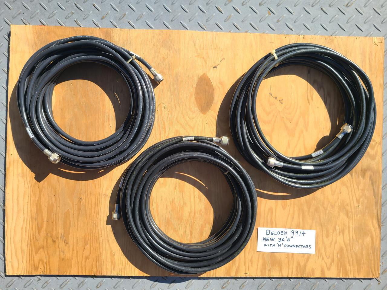 Three (3) factory rolls of new Belden 50 ohm 9914 cables with factory installed 'N' Male connectors installed on both ends. Each cable is 36' 0" long. Three (3) 36' rolls shipped USPS Flat Rate Box for $150. Any questions call Dave at 301-233-0910. Thanks N3EJT
