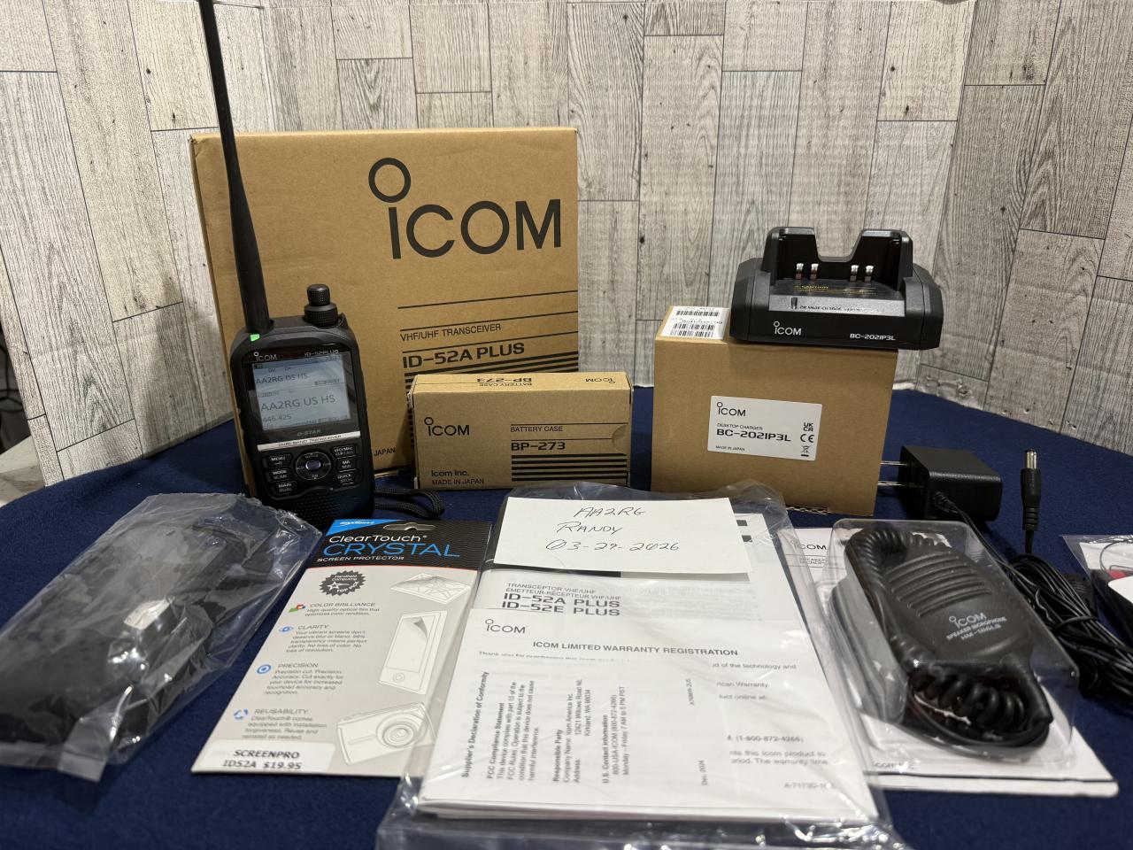 Here is a just like new Icom ID-52A Plus with extra screen protector, MB-PS1 strap, BP-273 battery case, LC-193 soft case, BC-202IP3L desktop charger, HM-186-LS speaker microphone, MARS mod from HRO. $695.00 shipped USPS in USA. This has almost no use on it. 73 and thanks for looking.