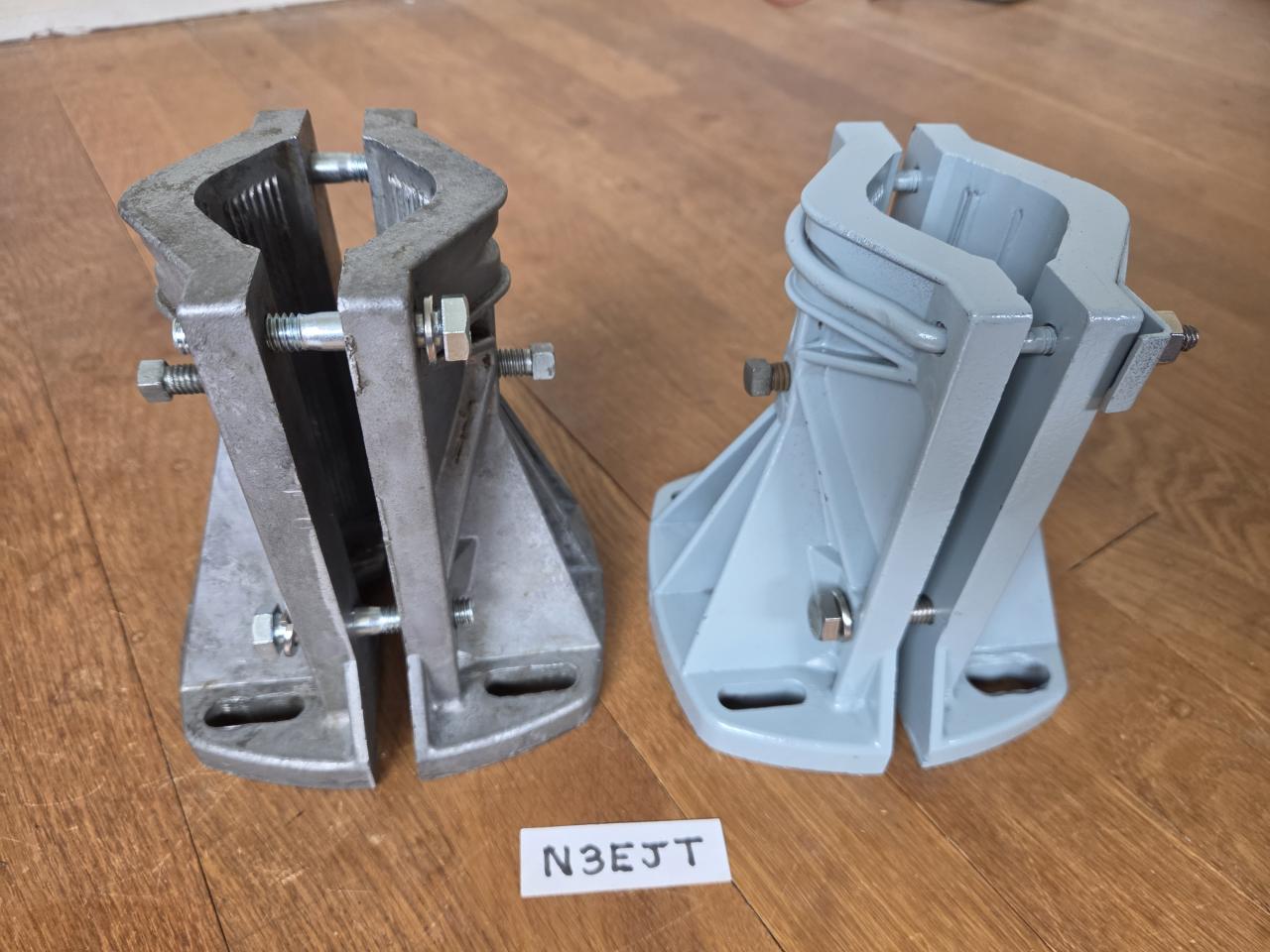 Two (2) Alliance (Z-19405) mast clamps. Left mount looks to be new. These work on Alliance HD-73 rotors. Will work on some Yaesu & Kenpro rotors too. Or use just to mount a mast down. You get the two mounts shown shipped for $93 to lower 48 states. Any questions call 301-233-0910. Thanks, Dave. N3EJT