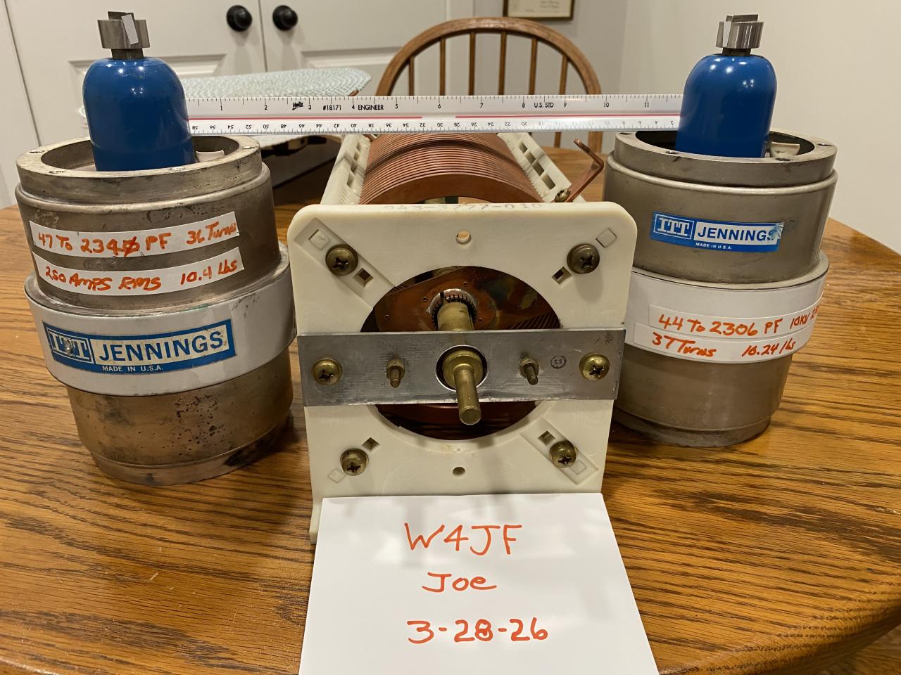 The vacuum variable capacitors are Jennings ceramic. Capacitance measures 45 to 2300 pF thrU 36 rotations. caps are RMS rated at 180-200+ amps, 250 peak amps. Caps are rated at 10 KV. Weight: 10.4 lbs each. They are appx 10" in length and 6" in diameter. Jennings model CVDB-2300-10N254