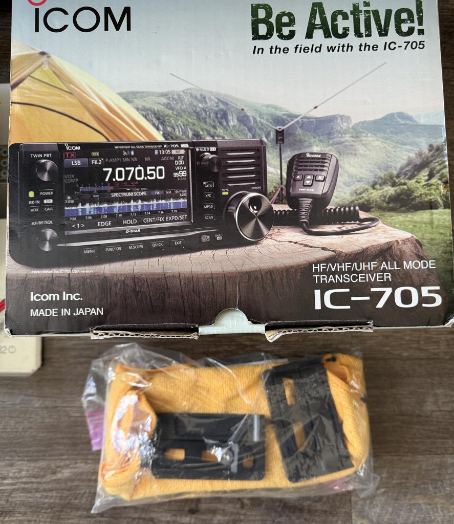 IC-705 in excellent condition with mic, box and Windcamp safety cage.