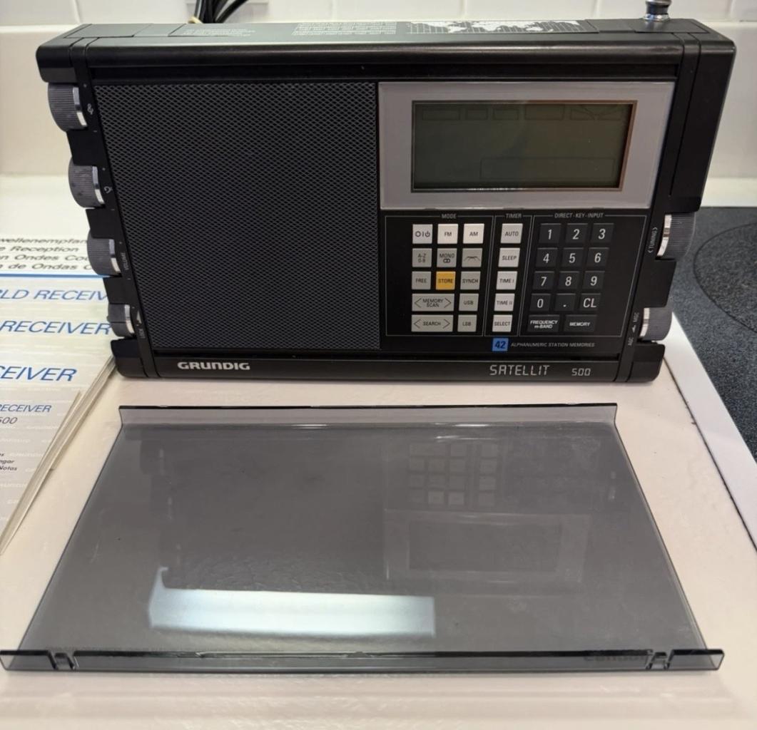 Grundig Satellite 500, infrequently exceptional Grundig Satellites in this condition come available to collectors or shortwave listeners. Some minor scratches on case back. All bands are working perfect, all original booklets with no marks, stains or tears.
