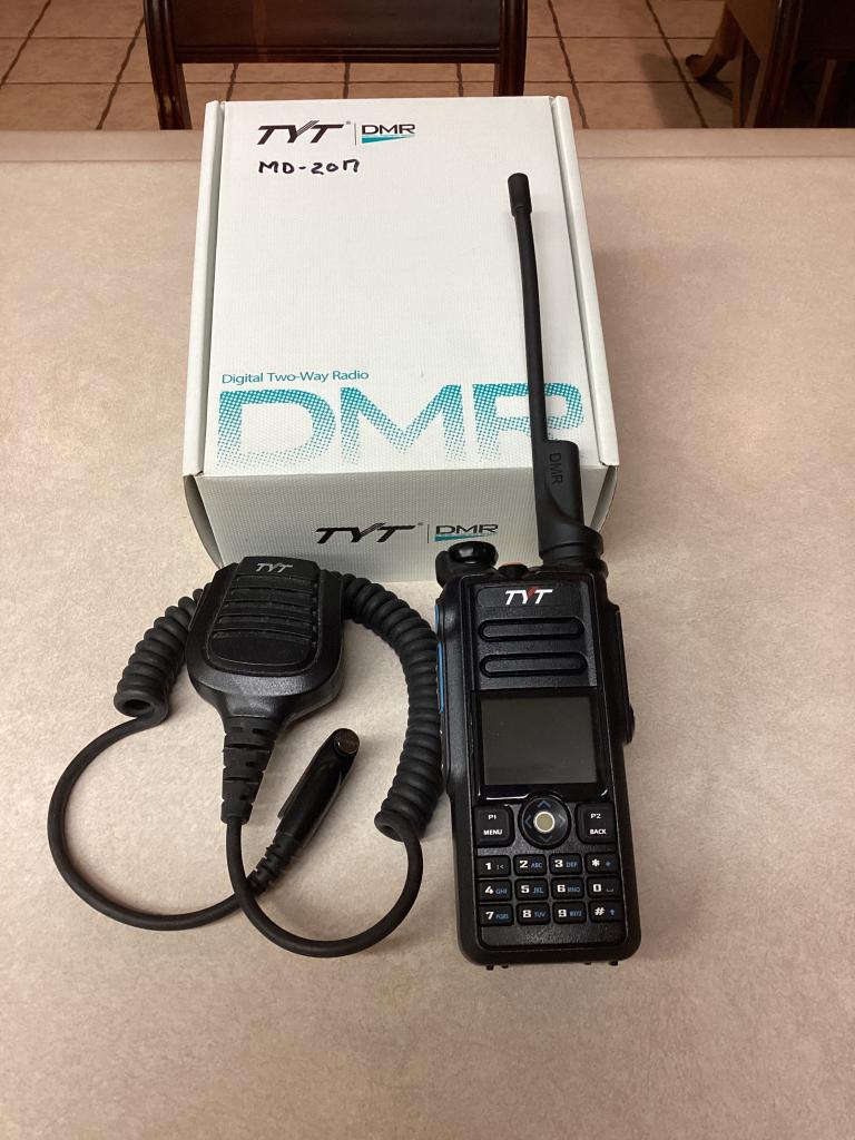 Selling my tyt-MD-2017 handheld radio with matching TYT Mic. Virtually new. Works 100%, no issues. Used very little, never out of the shack. Comes with box, manual, program cable, charger, and Mic. As seen in the pictures no marks. VHF/UHF, DMR. Selling for 130.00 shipped. United States only. Sold as is, no returns. I accept Zelle, and USPS money order. Contact Mason 214 293-4050