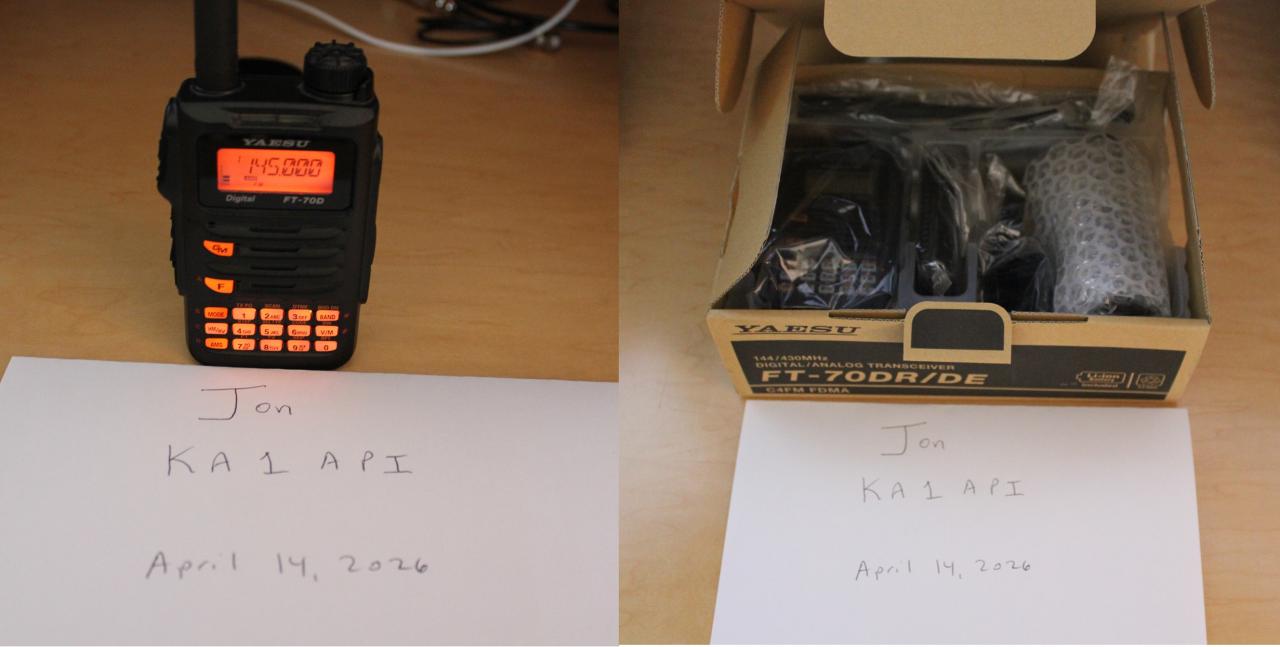 Yaesu FT-70DR with original box and contents. I was the original owner and it has had very little use. It is a few years old, and I am not sure how long the battery will hold a charge, so I am asking $110 shipped.