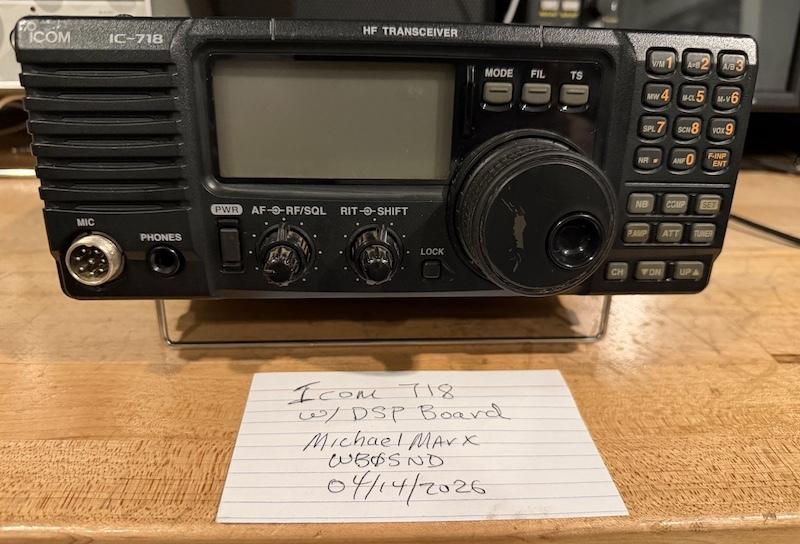 For Sale: Nice Icom 718 HF Transceiver with DSP Option. This radio covers 160 thru 10 meters at 100 watts output. It is a very rugged radio which makes it ideal for portable operations such as POTA. They have been very popular over the years for their ruggedness and ease of use as well as top performance. This one is in good operation condition. There are no known issues. Additional pictures and a video is available for the asking. The video is an Apple Quick Time video. The radio includes a power cord (13.8 Volts), hand microphone and manual. Shipped price is$475 to anywhere in the lower 48 states. Shipping outside the US is NOT AVAILABLE. If you would want delivery to Dayton or anywhere along I-70 between Dayton and St. Louis, I will sell for $425. This is also available for local pickup.