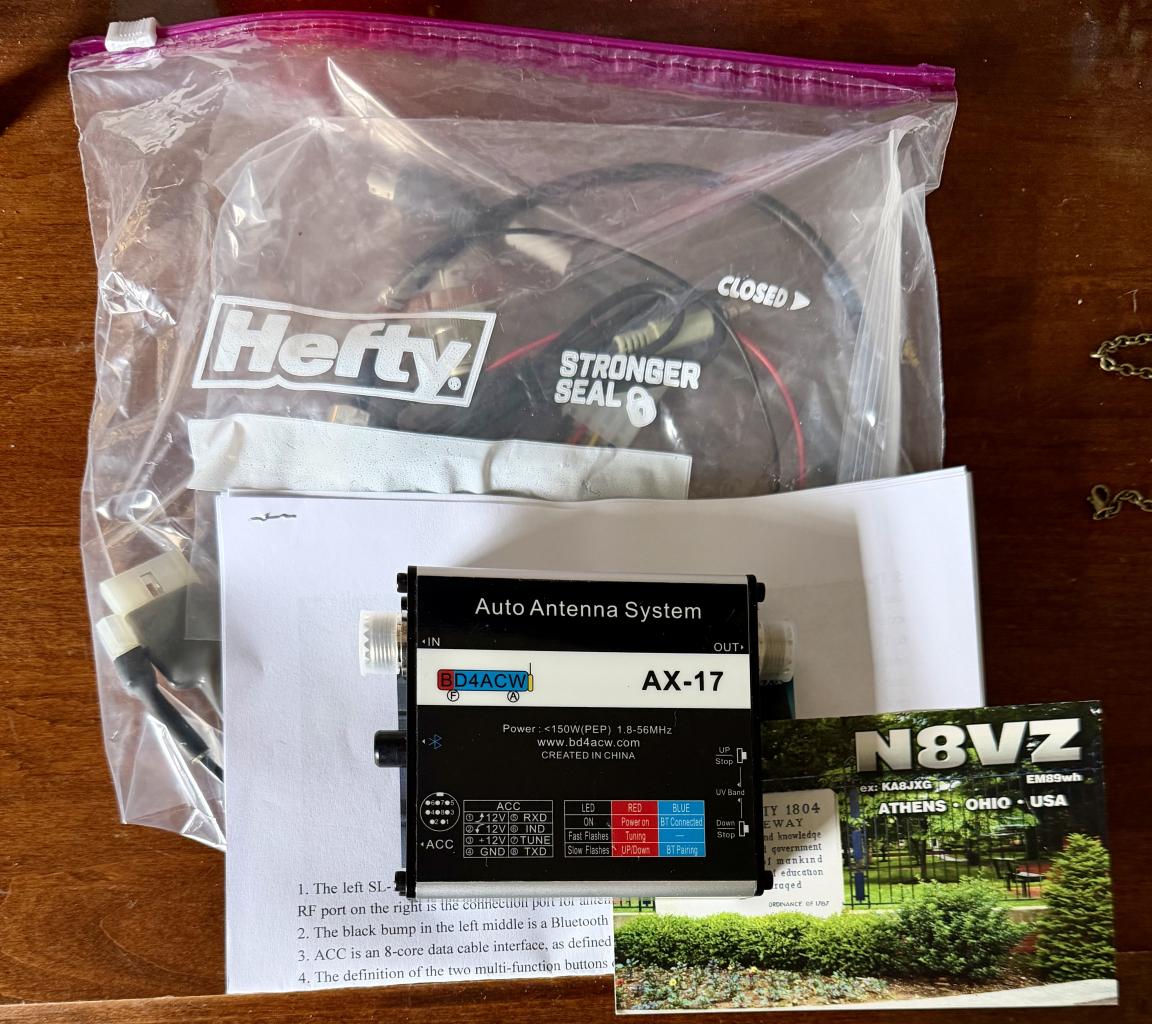 I have for sale an AX-17 screwdriver automatic antenna tuner. This the earlier non-pro version. It comes with all the cables originally packed with the unit. This tuner will work with ATAS-120A and Tarheel antennas, as well as many other screwdrive antennas. This unit has never been used and is in mint condition. Selling for $79 shipped to your CONUS QTH. Greatly prefer PayPal for payment, F&F unless you pay the fee. Zelle also a possibility. No personal checks or cashier's checks. USPS Money Order accepted.