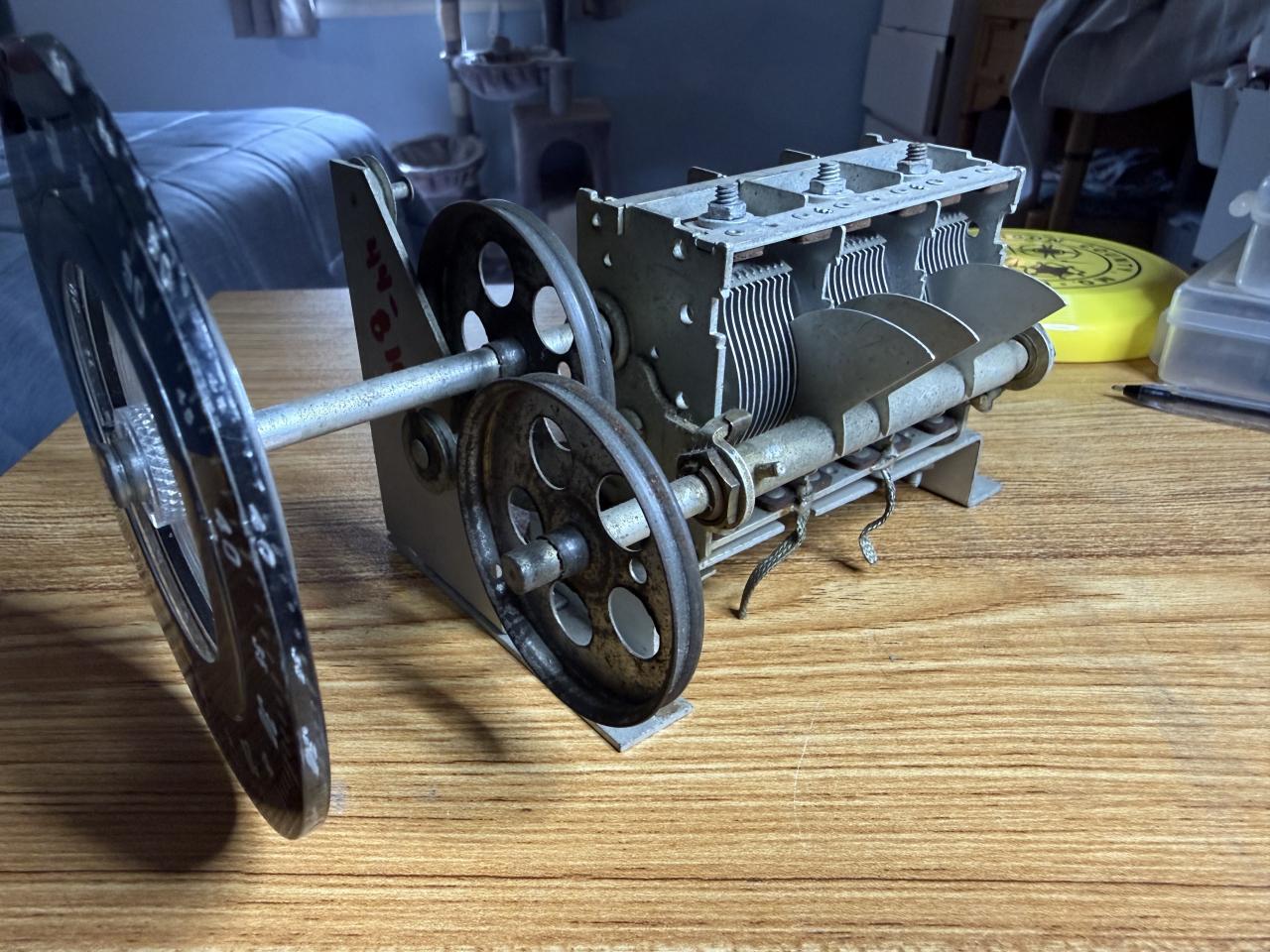 I saved this for a receiver project but want to clear out some space. I don’t recall what I pulled this out of, but it may have been from a National receiver. The capacitor fins are in good shape and they rotate freely. The rubber insulators that isolate the capacitor body from the base bracket are deteriorating but otherwise it’s in decent shape.