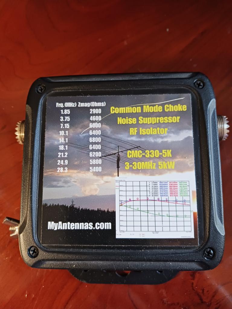 Brand is a MyAntennas model CMC-330-5K. Very nice choke to eliminate rf on the coax braid from the shack. I used with an OCF Antenna at the base of my tower. It is very effective. This is the high power (5kw) version. It is 1 to 1 matching with coax in and out. Asking $60 which includes shipping to CONUS. Check POMO, PaY Pal.