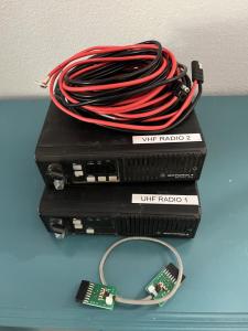 VHF/UHF (2 meters/70cm) Crossband repeater setup. Two GM300 mobile radios, one 16 pin crossband interface cable, two power cables. two RJ-45 shorting plugs for decode scan (something like that anyway, not a motorola guy).