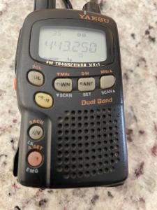 I am selling my Yaesu VX-1 "ultra compact" dual-band HT. I got it used a few years ago from an estate and bought a new battery for it. Although I have not used the radio in over a year, the battery charged nicely and is holding the charge. The indicia on most of the buttons are at least partially worn, but readable. The radio powers up, receives and transmits. I am able to hit the local 440MHz repeater full quieting at the radio's 500mW output. The radio can be powered by the charger for use, and will put out 1W.