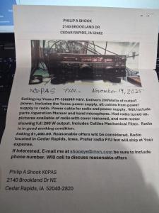 YAESU FT 1000MP MKV WITH ALL CABLES FOR RADIO AND POWER SUPPLY. HAND MIC AND COLLINS MECHANICAL FILTER. RADIO IS IN GOOD SHAPE WAS CHECKED OUT. PICS WITH COVER OFF SHOWING FULL OUTPUT ON WATT METER UPON REQUEST. IM POSTING THIS FOR A FELLOW HAM. k0pas price is $1400.00 plus shipping. please contact the owner for anything more. his name is Phil Shook