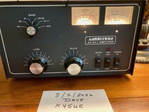 Lightly used Ameritron AL811 amplifier in good operational and physical condition with 811s replaced with 3 matched DX Engineering 572Bs. Used on 40 and 20 meters only. Never driven to more than 350W CW and 400W SSB because my antenna is in my attic. 10/12 meter modification has not been done, but it is a simple "cut the green wire" mod. I will included instructions on this mod. Wired for 120 volts but can be converted to 220 volts by a simple jumper change and replacing the fuses.