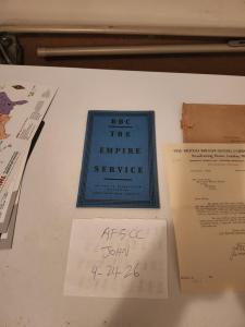 For sale I have a 56 page book published by the BBC titled BBC: The Empire Service. Published in 1936, it talks about the Empire Service, which was a shortwave broadcasting station in England. Talks about the history of the service, some technical details and its antennas, and plenty of other details. The book is in very good condition, and comes with the envelope it was sent it (complete with UK stamps), two letters dated October 1936 from the Chief Engineer of the BBC sent to the purchaser of the book (on watermark paper), and a sheet with the Empire Service frequencies on it.
