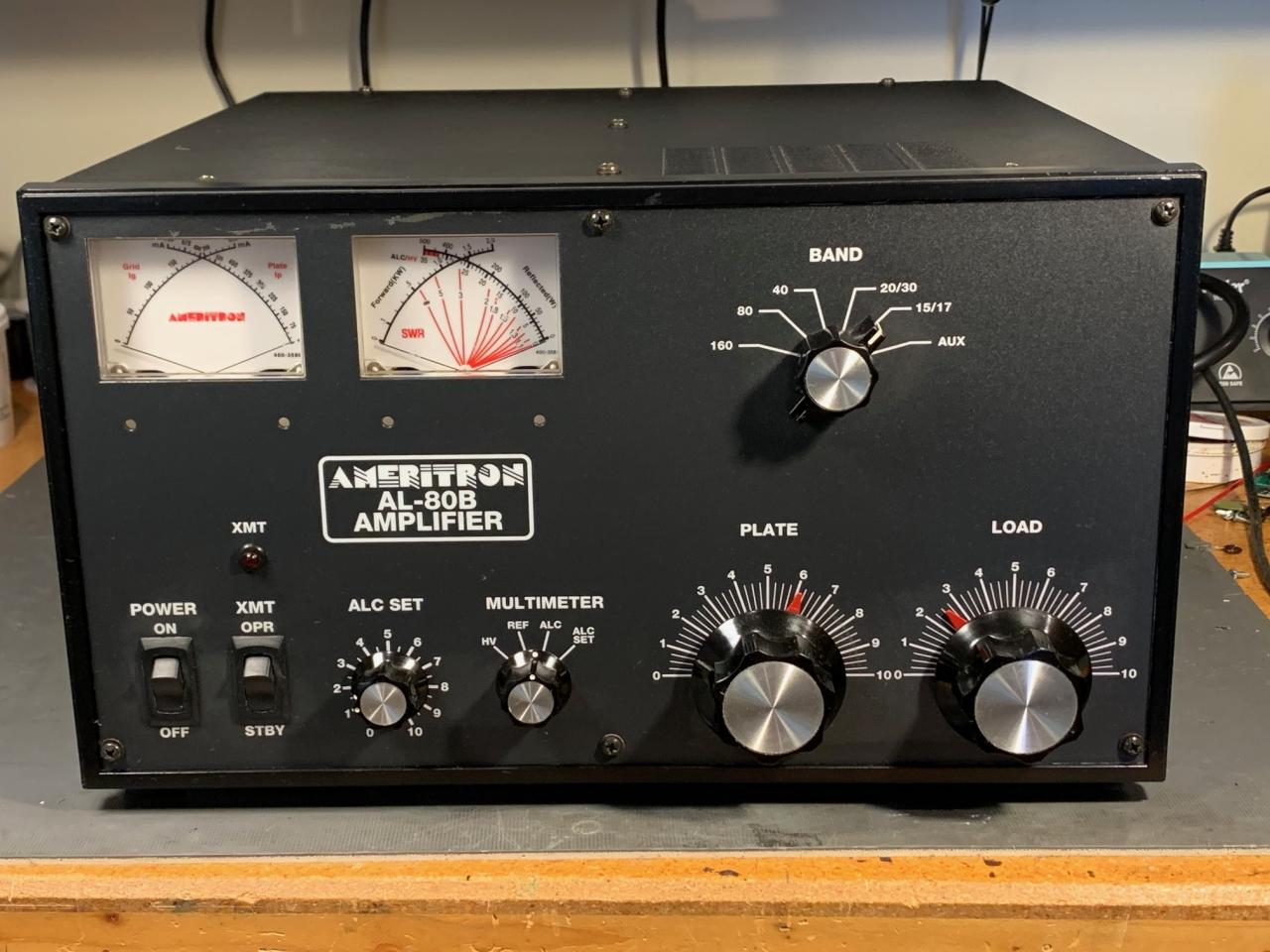 I'm selling my Ameritron AL-80B HF amplifier for 10 - 160 meters. The amplifier is in very good and clean condition. Includes original manual. Wired for 120 VAC. The 3-500 may be getting a bit soft as I'm measuring 800 to 950 watts PEP depending on the band, slightly less on 10 meters, on my non-calibrated CN-901 Power Meter.