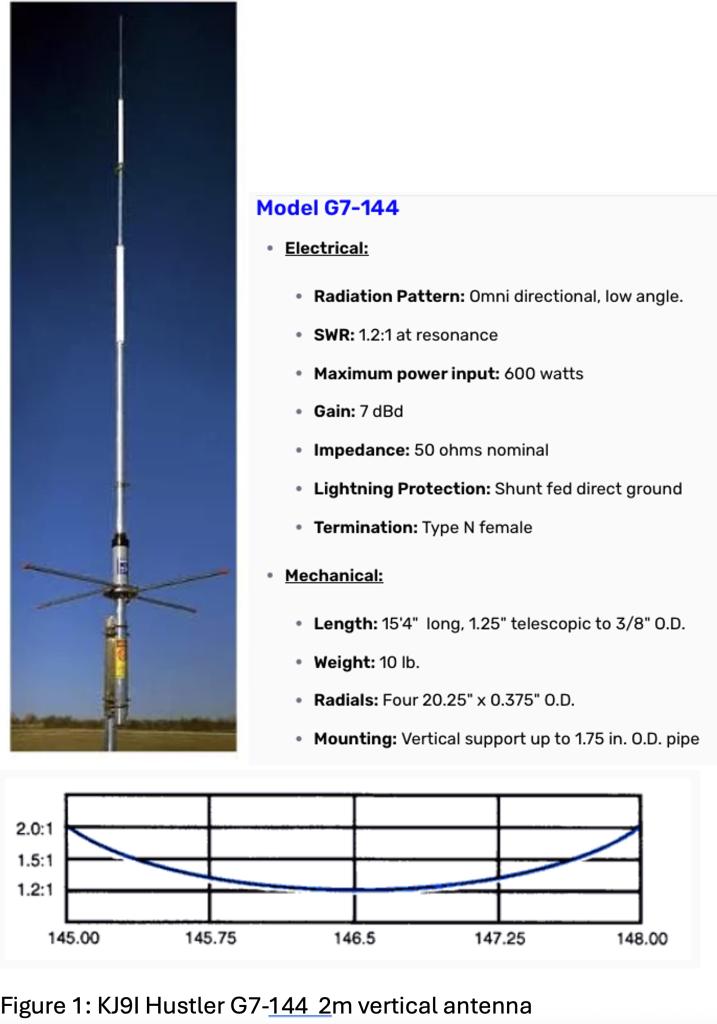 For Sale: Good used Hustler G7-144 2m gain vertical antenna. 15 feet, 4 inches tall with four bottom aluminum radials. 600w power limit. 7dBd Gain. 50 Ohm impedance and type N female connector. $175 shipped continental 48 USA (new price $460 plus shipping).