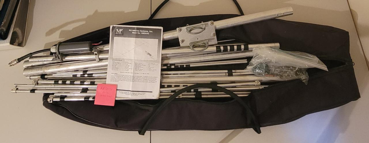 I had not put it up or together, So it must go. M2 Antenna Systems 5 element 6-meter beam travel beam Model Number 6M5XHG. Comes with caring case. This was only used once in 2015 in Montserrat and easy to setup and take down.