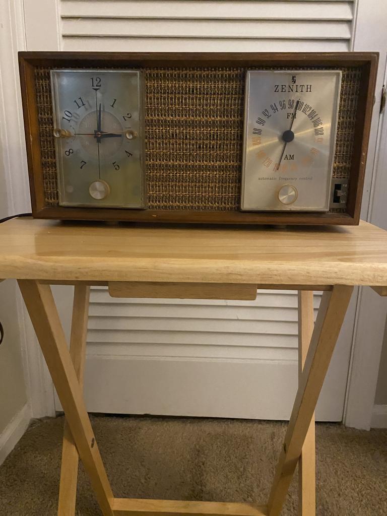 ZENITH ® Model X390 Chassis 7N06 table top vacuum tube clock radio. The reception is very good. Clock not functioning. The Cabinet and power cord are excellent. Make an offer on it! PayPal and Venmo will only be accepted for payment.