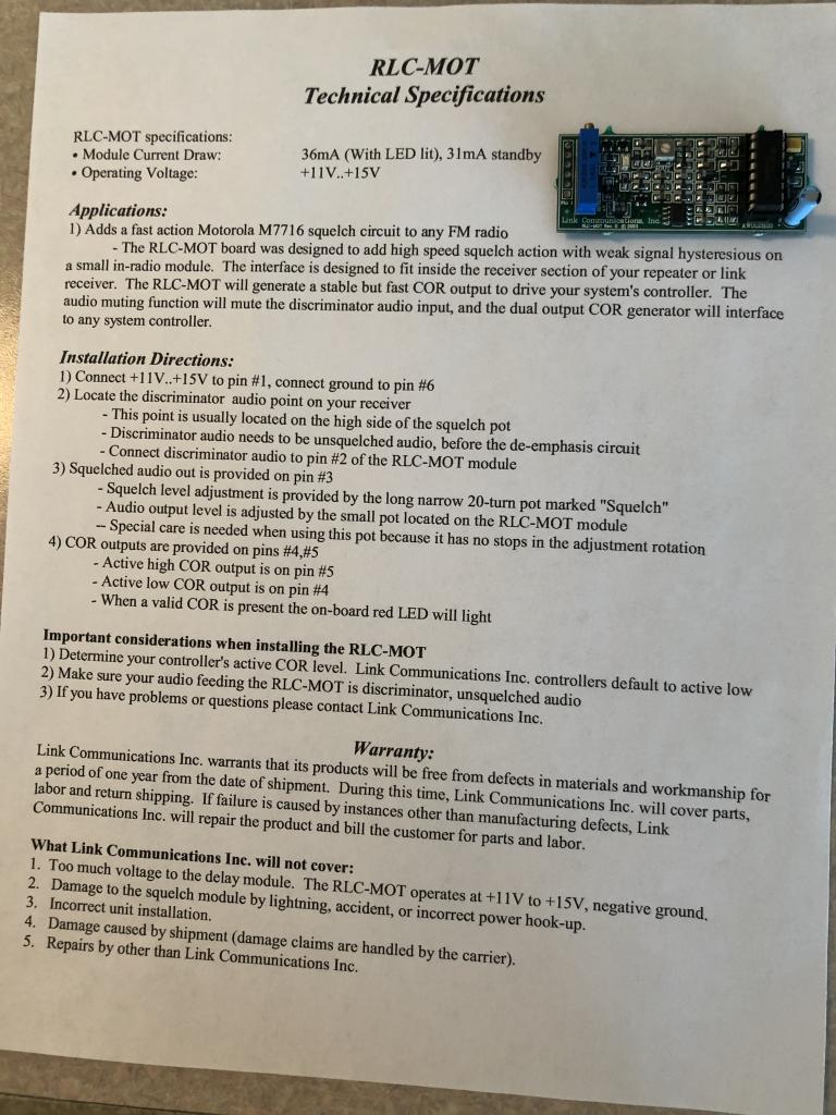 THE RLC-MOTOROLA BOARD WAS DESIGNED TO ADD HIGH SPEED SQUELCH ACTION WITH WEAK SIGNAL HYSTERESIOUS ON A SMALL IN -RADIO MADULE . ( NEW ) .