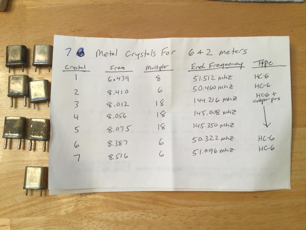 Found these while looking for something else. 7 hc6 type crystals for 6 and 2 meters. See chart for fundamental frequencies and where they multiply up to in the 6 or 2 meter band. $15 for all 7 includes shipping. PayPal preferred but flexable, PayPal allows me to print a shipping label and leave in mailbox for postman to pick up. 73 Bill W9VC