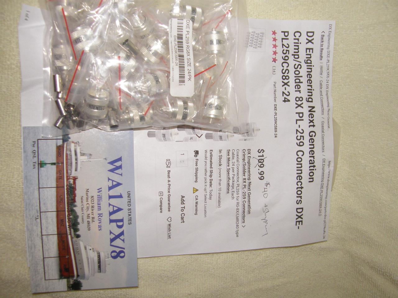 DXE-PL259-CSX-24 pk RG8X. Crimp Solder Connectors 24 pack. New in package, still sealed. Regular DXE price $109. My price $40 + $12 shipping stateside.