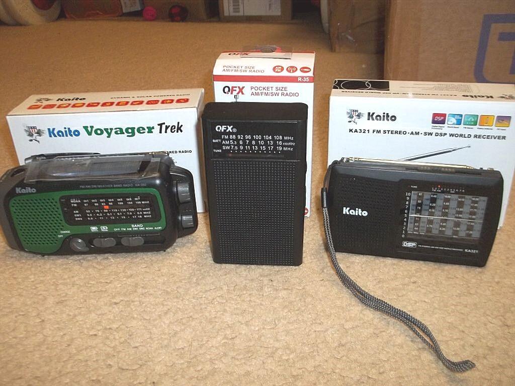 First is a Kaito KA350 AM-FM-SW-Weather radio. Battery can be recharged by handcrank or built-in solar panel.