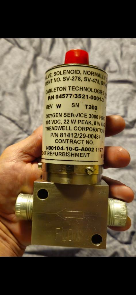 This listing is for a matched pair of Carleton Technologies oxygen-service solenoid valves with Treadwell-manufactured bodies. Both valves share the same model number (04577/3521-0001-3) and are rated for 3000 PSIG oxygen service. Each unit is powered by 105 VDC and draws 22 W peak / 8 W average. Perfect for aerospace repair, oxygen delivery systems, high-pressure pneumatic control, research applications, or aviation surplus collectors.