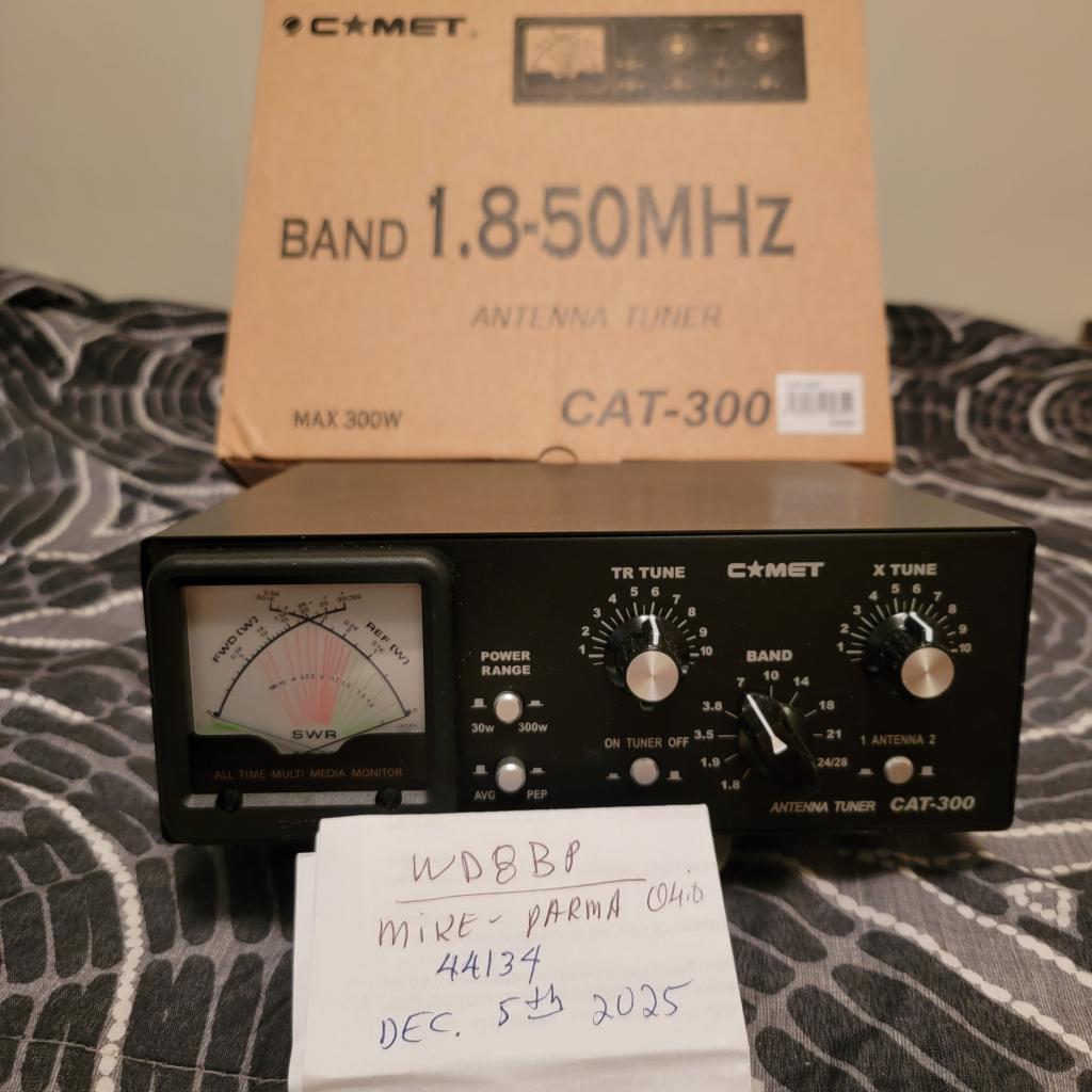 For Sale: Comet CAT-300 1.8 – 50 MHz 300W Manual Antenna Tuner. Original owner purchased from DX Engineering, from non-smoking home. Tunes antenna's of all sorts of very well-wide range tuner. Very nice color meter. New condition, and operates same way. CONUS only. Accept postal money order,cashiers check,personal check,ZELLE or Venmo, or cash for in-person sales. Price CHANGE--$200.