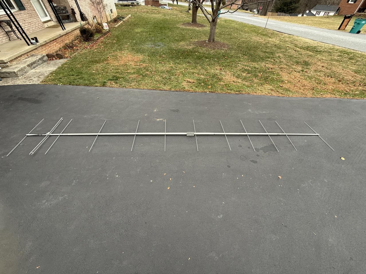 This is another antenna that we rescued from a ham radio estate two weeks ago. All parts are there, and it has been reassembled on my driveway for this picture. It has 12 elements and is 19' 6"long (end to end). I will need to break it down for shipping, unless local pickup occurs (my preference).
