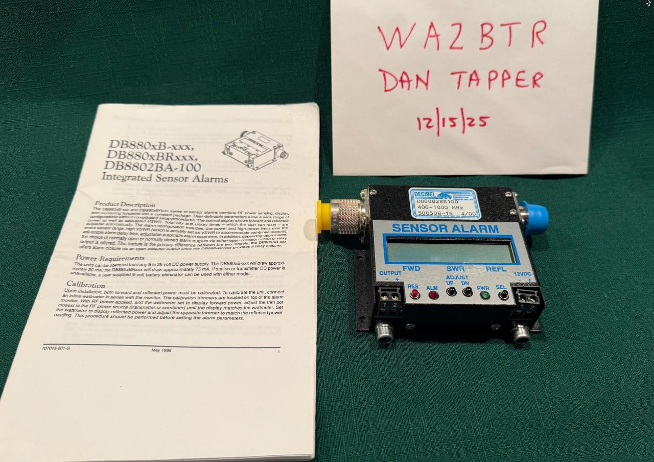The model number is DB8802BR100. This is a sensor that combines RF Power Sensing, Display and Monitoring Functions into a compact package. The usable range is 406-1000MHz and it is powered by 9-28V DC and will handle up to 100 watts. User configurable settings include forward/reflected power and VSWR. The alarm configuration includes low or high power limits, high VSWR, adjustable alarm delay time and reset time. The alarm will sound if any of the preset parameters are exceeded. It also has a relay closure outputThis unit has never been used. I prefer Zelle but will also accept PayPal. $55 plus $12 CONUS shipping.