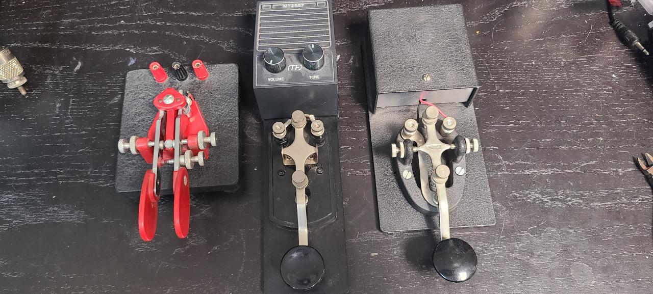 FS: CW paddle and a couple of straight keys with tone oscillator, from a recent SK ham friend of mine. The paddle is unmarked in terms of brand, but is in very nice condition. I cleaned up the contacts and seems to work fine. $25 pickup or plus shipping. Next is a MFJ-557 straight key with built-in oscillator, with tone and volume control. Uses 9V battery. Note, this key needs a spring under the key, otherwise it is continuously making contact. Works otherwise and is in very nice condition. $20 pickup or plus shipping. Next (on right on image) is a Wm Nye branded code oscillator with a straight key mounted that is branded Speed-X. Uses 9V battery. In very good condition and works good. $40 pickup or plus shipping. You can remove the wires from the key to the oscillator and use the key with a radio. Base holds key well. All sold pickup NNJ 07860 or plus shipping. Accept USPS money order, Zelle or Walmart wallet or personal check with address matching qrz. Sold as-is no returns.