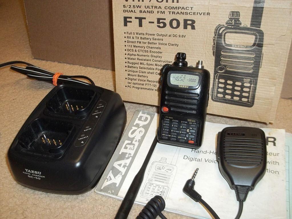 PRICE REDUCED!!! FOR SALE: Good looking Yaesu FT-50R dual band (144 and 440 MHz) HT. This radio has been tested and is working fine. This radio is in good condition, showing some wear, but no crack or breaks. Comes with box, manual, antenna, speaker/mic, NC-50 rapid charger, belt clip, and a battery that appears to be good.