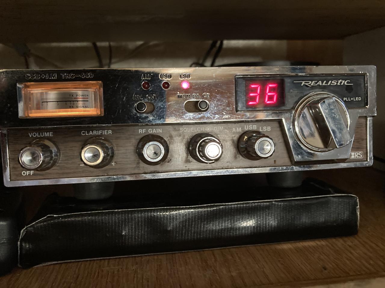 RadioShack trc449 in great condition. Works very well. I put rubber feet on the bottom but I will remove if you don’t want them on there. Comes with power cord and hand mic.