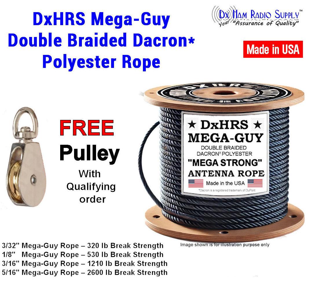 DxHRS Mega Guy double braided rope with FREE PULLEY on qualifying orders! Double braided Dacron (Polyester) rope made in the USA. mildew, UV, rot, and abrasion resistant, with minimal stretch, making it ideal for long-term outdoor use. We stock a full range of sizes: - 3/32" (break strength 320 lbs) - 1/8" (break strength 530 lbs) - 3/16" (break strength 1210 lbs) - 5/16" (break strength 1790 lbs) Also available: 3/8", 1/2", and heavy-duty gin pole rope in 7/8" and 1" sizes. Great for pulling, hauling, marine, commercial, and military applications. We are a family-run business, proudly committed to fast shipping and complete customer satisfaction going on 12 years now. Please visit us at https://www.dxhamradiosupply.com. We truly appreciate your support. 73- George KV4YS