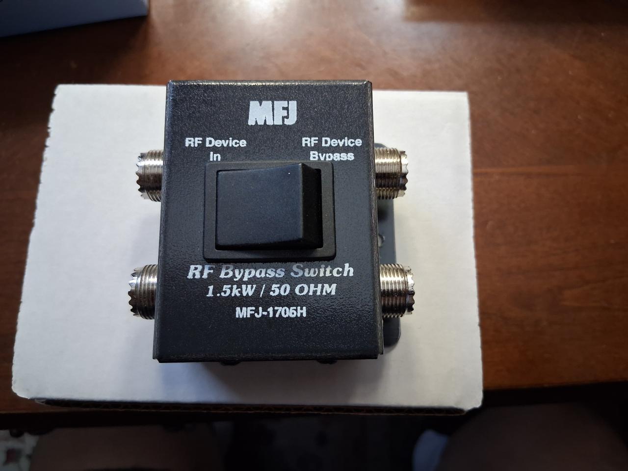 Connect your antenna and transceiver to this MFJ RF Bypass Switch and you can switch in or bypass your antenna tuner, linear amplifier, preamp, wattmeter or other device. Switch in and bypass any coax fed device with PL-259 UHF connectors. DC to 60 MHz. SO-239 connectors 50-75 Ohms. Great used condition in original box. $35 shipped conus.