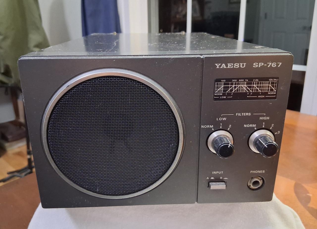 The Yaesu SP-767 speaker features audio filtration with two audio inputs and a post-filtration 1/4-inch headphone output. The 8-ohm speaker can handle up to 3 watts and has a 4.7-inch (120mm) speaker element. The frequency range is 100 to 12000 Hz. The rear panel features dual RCA phono input jacks. It measures 8 x 5 x 12 inches (200x129x306 mm). This speaker matches the Yaesu FT-767GX. Makes signals more readable through moderate QRM. A few scratches on the top from previous owners but functions as it should. $65 shipped conus USPS money order preferred not set up with PayPal or others.