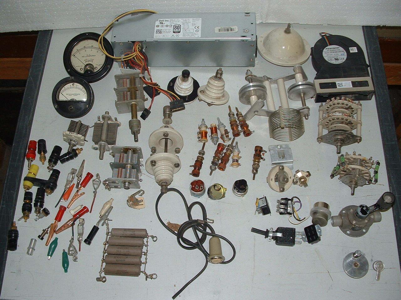 Offering for sale about 10 pounds of VINTAGE RADIO PARTS. Includes, variable capacitors, meters, coils, ceramic beehive insulators, 12 volt blower, Dell computer power supply, neutralizing capacitors, Jones connectors, 100 watt dummy load, ceramic switches, 5 way binding posts, and more. Take a good look at the picture. What you see is what you get. All for only $39.95 postpaid within the United States. I accept paypal, postal money orders, cash, and checks (hold for clearance).