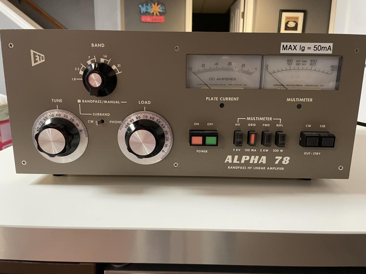 Alpha 78 S/N 8824. Excellent condition. Age of tubes unknown. No sticky paint. Has 10m modification only. Includes manual. Features Bandpass preset for 80m - 15m (CW/Phone sections). Manual tuning on 160m and 10m, as well as 80m - 15m.