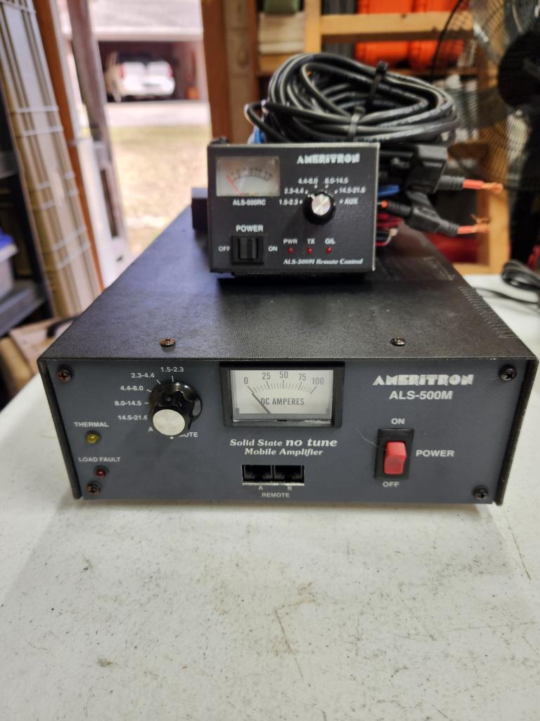 SOLD PENDING FUNDS from Jason * For Sale: Ameritron ALS-500M Amplifier with Remote Control & Cabling & also 10M Module. Extremely low usage total, Maybe 10 to 15 minutes total. A Really Rare Find. Can ship in original factory packaging at Buyers Expense. However, prefer pickup at my QTH or will have it at the Dardenelle Arkansas Hamfest March 7th. Package Price is $875 USPS Money Order or Cash in Person. Sorry No PayPal.