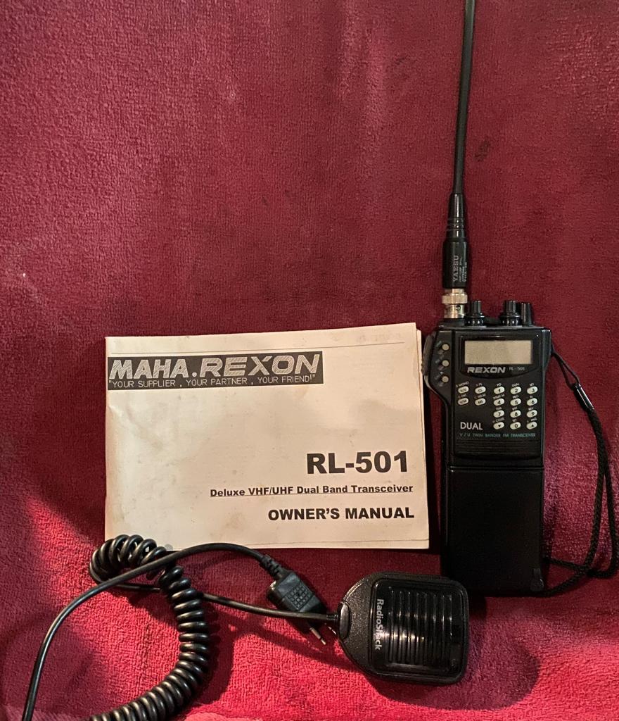 Rexon RL-501 true dual band HT. 100 memories per side, CTCSS. Shows normal wear, 1650 mah extra battery, manual, Radio Shack Speaker /Mic included.