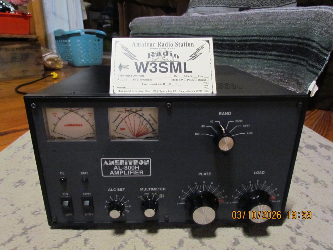 I am selling my Ameritron AL-800H amplifier. In excellent physical and operating condition. I installed a new set of 3CX800A7 tubes from DX Engineering in October 2024. Full output; no sweat. You're getting the whole amplifier with nearly new tubes for the cost of the tubes alone! Prefer local pickup in Central Kentucky. Will travel a reasonable distance to meet. $2,000. No texts, please. Thanks for looking.
