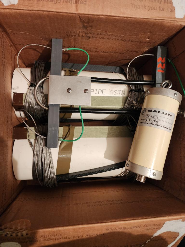 B-Squared Engineering FD-122 160M-10M Terminated Folded Dipole Antenna System. This is brand new in the box, never removed. Less than 2:1 VSWR from 1.5 to 30 MHz. 600W rated on 80-10, 300W on 160M. Stainless steel wire and PVC spacers (not cardboard like the prototype on their website!). I bought this several years ago, but never got around to installing it (a bad habit of mine HI HI). See all details at the company website: