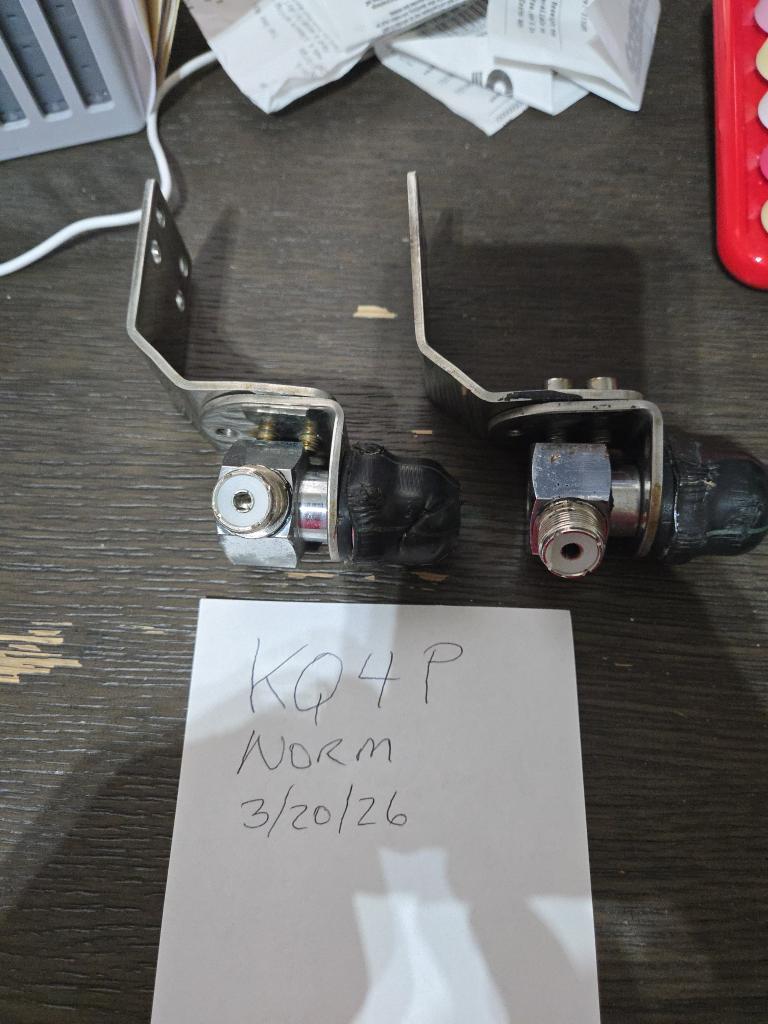 A pair of antenna mounts 3/8-24 stud to right angle UHF Female.