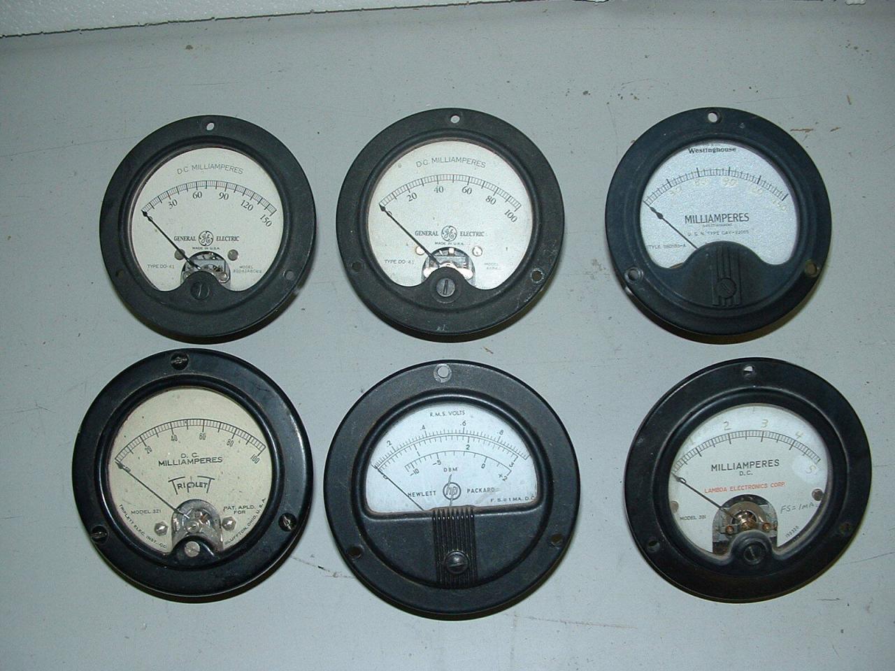 Offering for sale a lot of 6 VINTAGE 3.5 inch diameter METERS. They have the following scales: 100 microamps; 150 milliamps; 1 milliamp; 100 milliamps; 150 milliamps; and 5 milliamps. The last two have been altered from other scales to lead as listed. Take a good look at the picture. What you see is what you get. The whole lot for only $39.95 postpaid within the lower 48 United States. I accept paypal (preferred goods & services); postal money order, cash, or checks (hold until it clears).