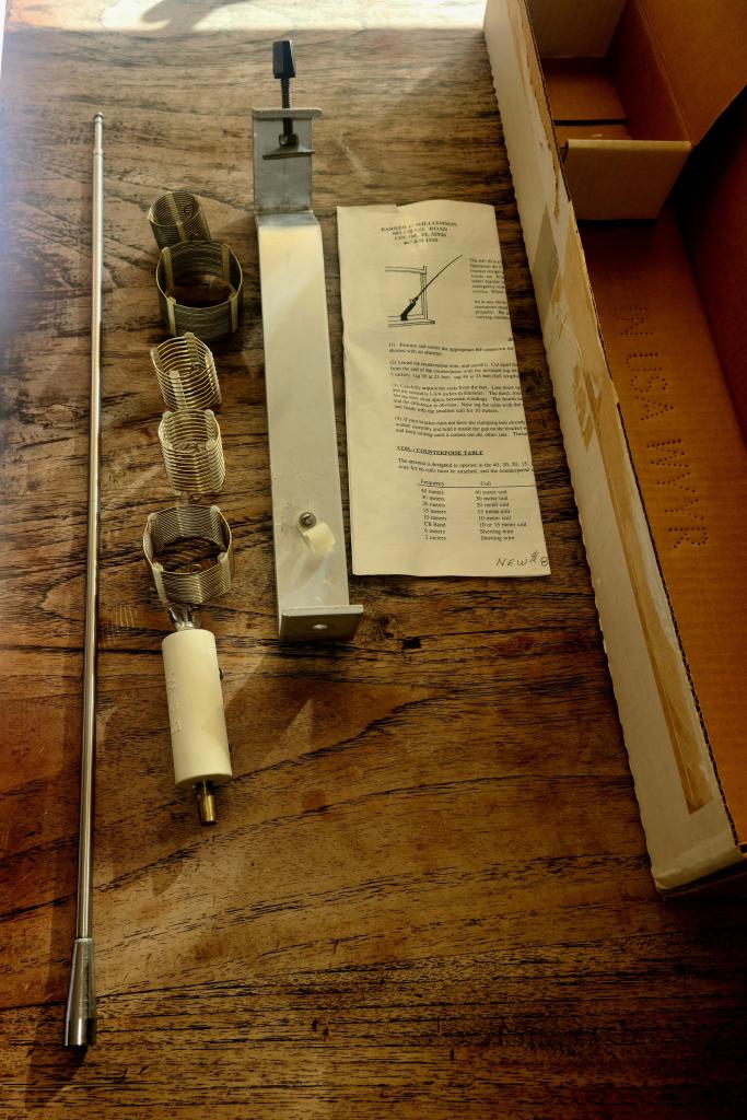 The Barker & Williamson AP-10A is a compact, portable, base-loaded HF antenna designed for renters, travelers, and field operators, covering 7 through 30 MHz (40-10 meters) plus 2/6 meters. It supports 300 watts CW/SSB, featuring a telescoping whip (up to 57 inches) and a 35-foot counterpoise wire, allowing mounting on windows, chairs, or tables