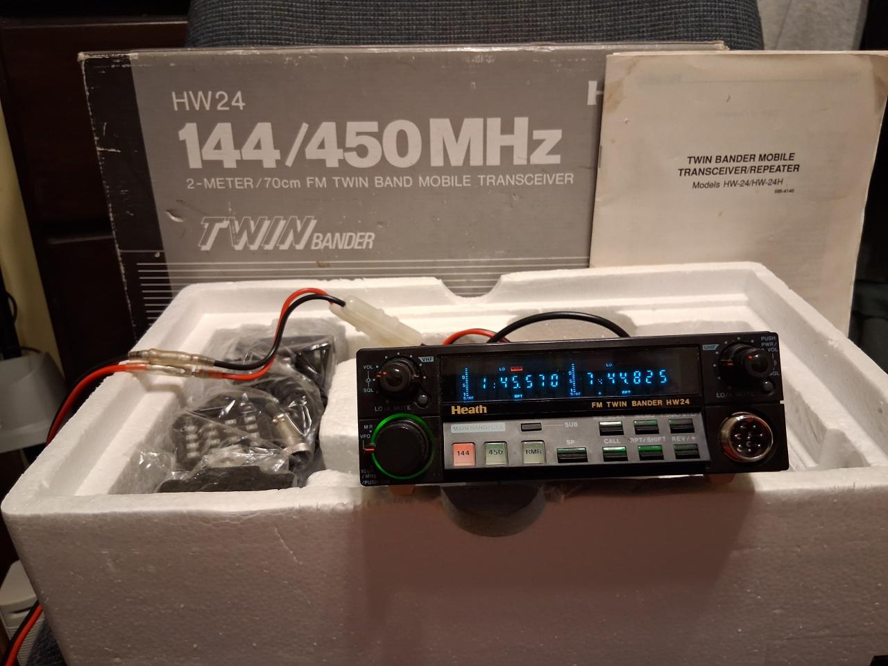 Hello everyone,….I have up for sale a very nice vintage Heath/Standard dual band 144/440mhz transceiver, model HW24. This is an “Oldie but Goldie” from the 80’s in very nice physical and operational condition. This is a very cool-looking radio built by Standard Radio for the Heath Company while they were still in business. As far as I can tell, all of the original accessories are still in the original box. Heath marketed two models, one high power and one low power. This is the low power version running 10 watts output. If you remember this radio, then you remember how expensive they were when sold new. I am asking $145 for this piece of history including shipping to the US. Thanks & 73,...Tim (K8TBS)