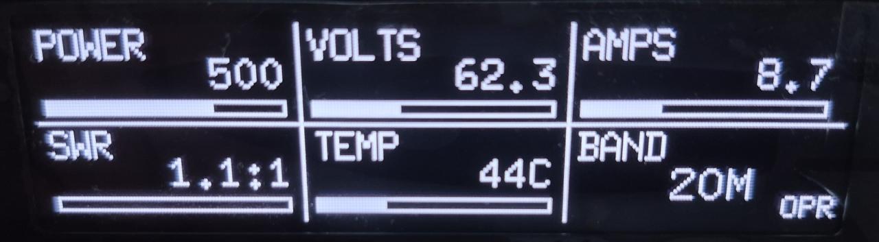 Six critical parameters, always visible, updating 10×/second on a high-contrast 256×64 OLED. No menu cycling. No squinting.