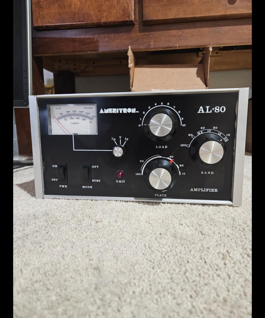 Selling my personal Ameritron AL-80 amp. This is the original AL-80, not the AL-80A or B. Small footprint desktop 1KW amp. Has had upgrades to bring it up to AL-80A specs. So this amp has full output from a single 3-500Z tube. On 120v output is about 750w PEP SSB. On 220v puts out full KW. So, this amp suffered shipping damage at some point during its life, but it's a nice clean fully functional amp. I used it daily with no issues at all until I got a solid state amp... Happy to talk about it if you want to contact me. Need $450 + shipping for it. Can take additional photo if wanted. It's just excess to my needs and lives unused now for the most part on the floor under my desk. Nice amp, you'll be happy with it I'm sure.
