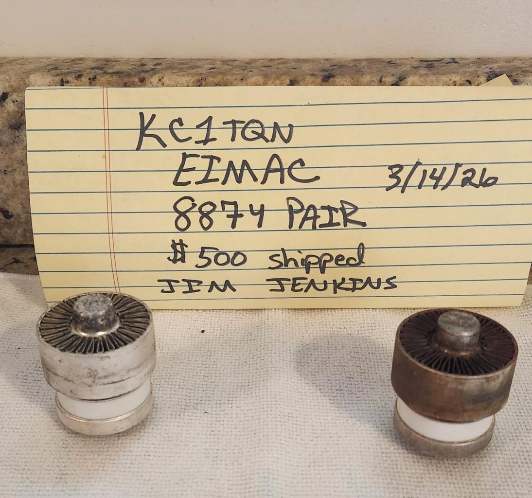 Pair of Eimac 8874's. Easy 1200w output. From 1980 was in my Alpha 374A when I acquired it last year. 1 tube looks like the last girl at the bar at 2am but works just fine. Working video I made a few weeks ago attached.